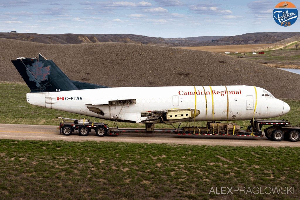 We share images sent by Rik Barry that illustrate the transfer of the Fokker F-28 Mk.1000 C-GTAV cn. 11106. On April 26, 2024, the airplane began its last journey when three trucks and seven cars left Saskatoon, Saskatchewan for Lethbridge, Alberta in Canada. The convoy arrived at its destination on April 29, after traveling 700 km in four days.